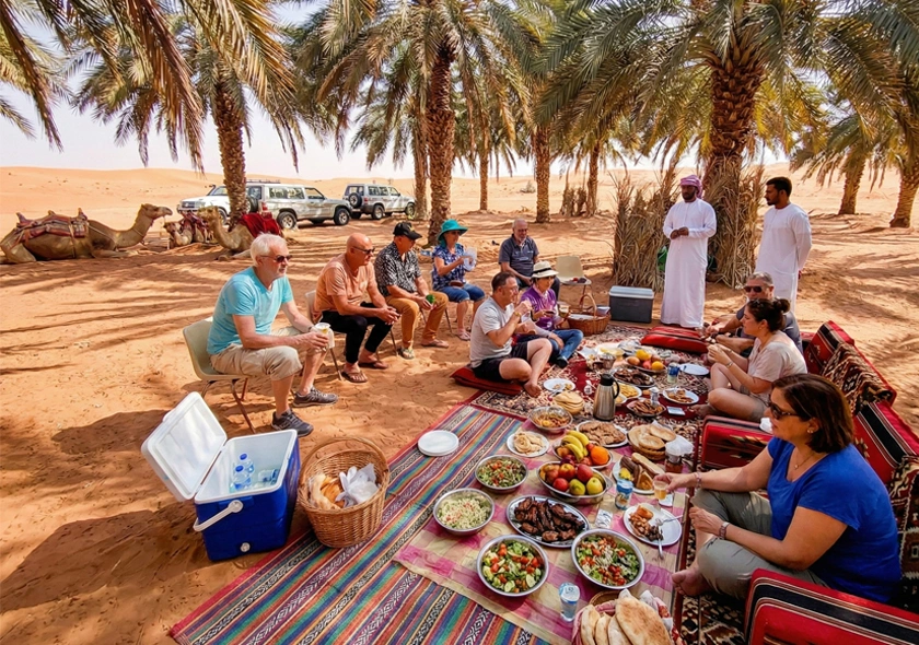 Relax and enjoy a picnic lunch in a calm desert setting, surrounded by endless dunes.